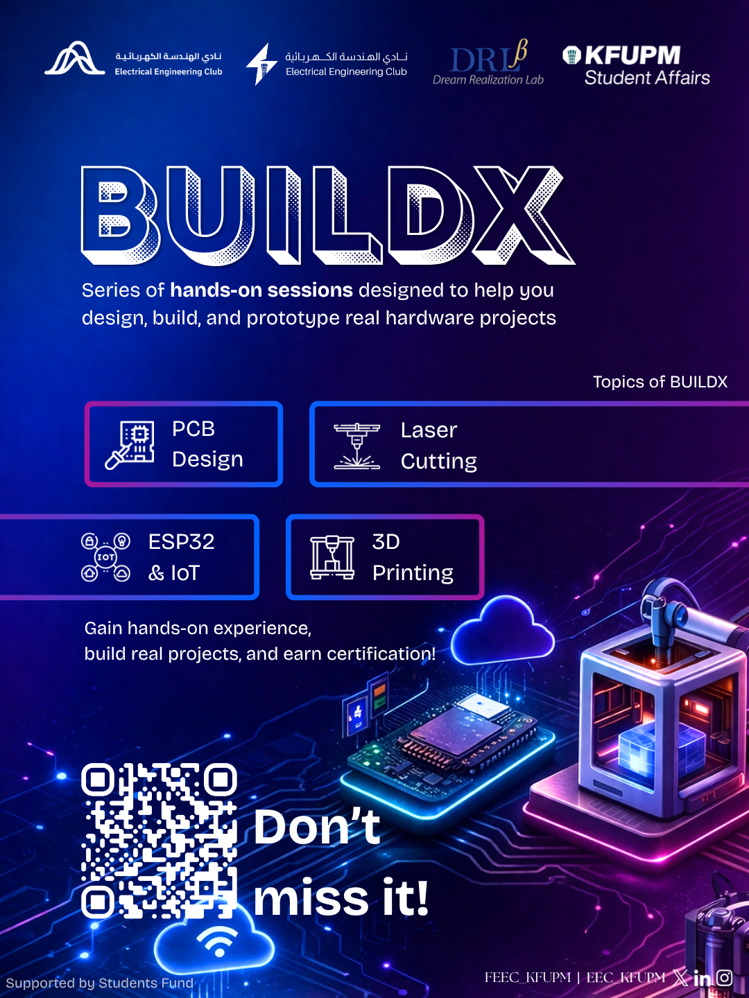 BUILDX is an intensive, hands-on series designed to help you design, build, and prototype real hardware projects. Organized by the KFUPM Electrical Engineering Club, this program provides the tools and environment needed to bridge the gap between academic theory and physical fabrication.